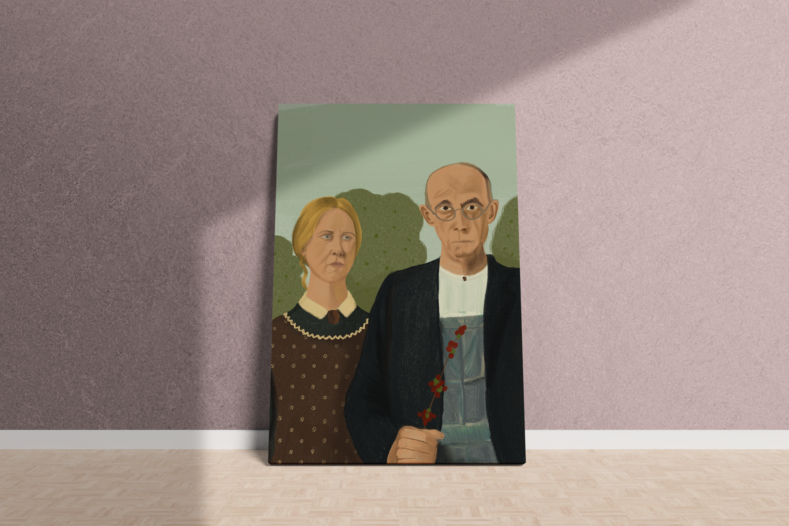 Una mirada audaz y contemporánea a uno de los íconos del arte estadounidense. Góticos Cafeteros reinterpreta el famoso retrato rural de Grant Wood desde una perspectiva latinoamericana, cambiando el tridente por una rama de café maduro: símbolo de trabajo, tradición y conexión con la tierra.